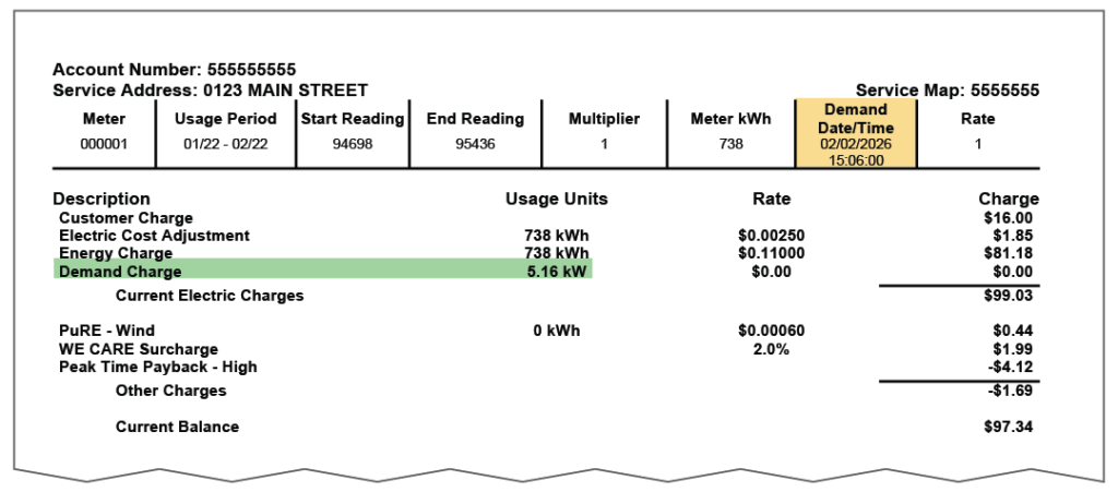 On the back side of your bill, you can find your household’s maximum demand measurement for the month, as well as the time that measurement occurred.