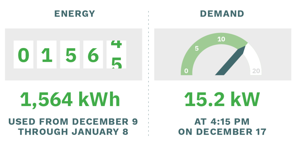 Energy is measured like an odometer, and is the total amount you’ve used over time. Demand is measured like a speedometer, and is how much power you are using in any given moment.