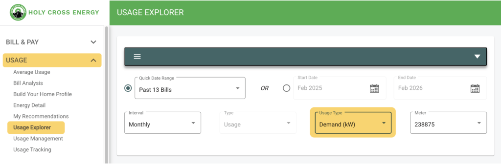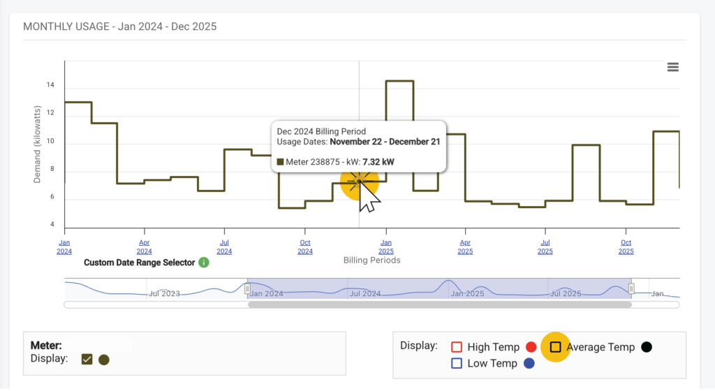 Highlighted here in yellow, this area will show you the day and time your peak Demand occurred that billing cycle.