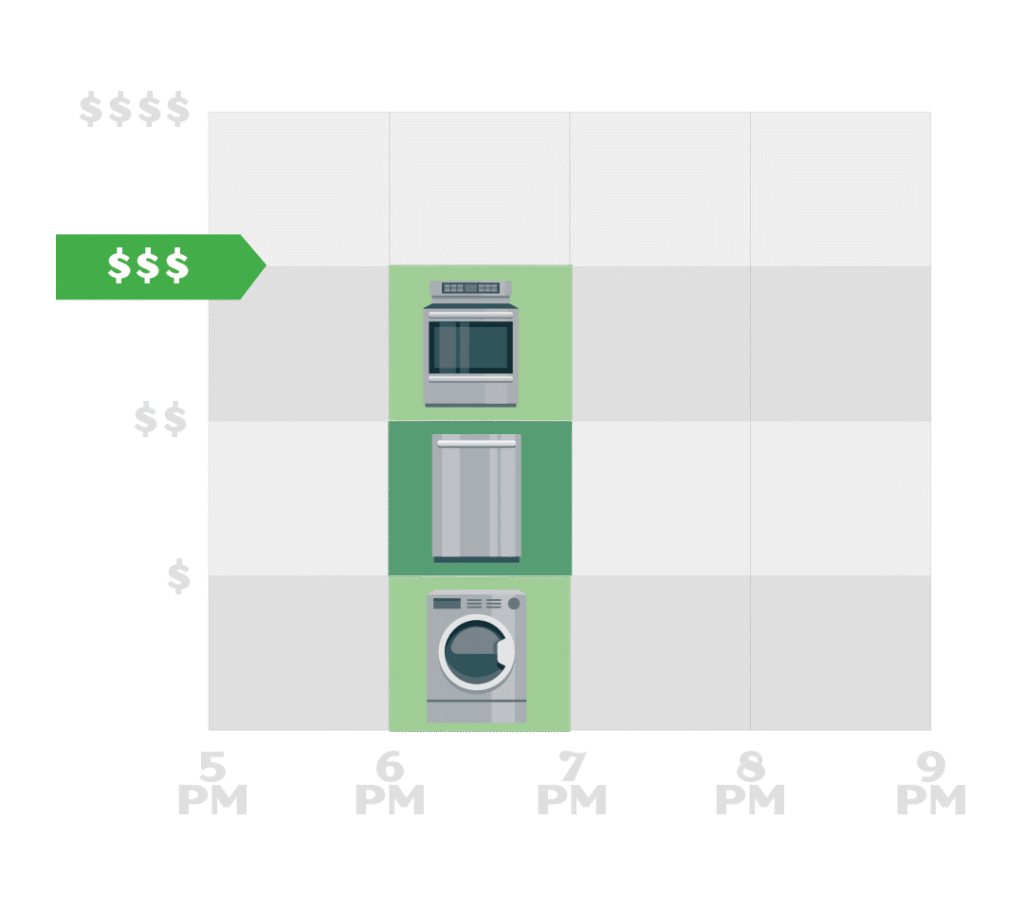 Piensa en cada electrodoméstico grande como si fuera su propio pico de consumo. Si usas varios a la vez, creas un pico de consumo más alto.