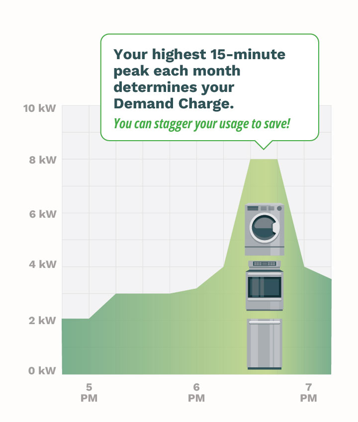 If you have solar, you can use your biggest electric appliances when the sun is shining to help reduce your demand and your bill.